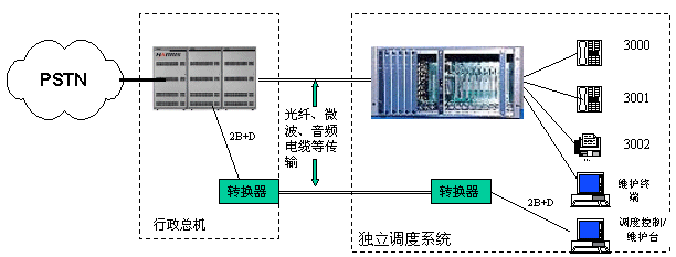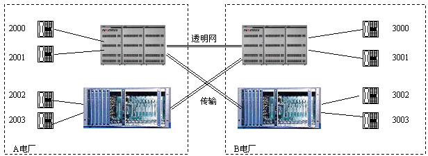 適用范圍:這種應(yīng)用適用于對電話系統(tǒng)安全性要求嚴格的場合,如電力系統(tǒng)行政交換機與調(diào)度交換機就可以以上述方式實現(xiàn)備份,從而實現(xiàn)行政或調(diào)度交換機某一臺不能工作時,依然可以通過備份系統(tǒng)打電話。