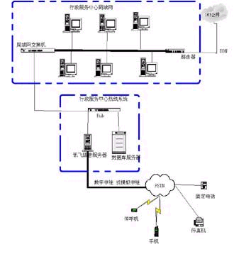 政府群眾一線通”系統(tǒng)可以通過(guò)局域網(wǎng)連入行政中心局域網(wǎng)交換機(jī),從而實(shí)現(xiàn)與整個(gè)行政服務(wù)中心的信息共享和熱線系統(tǒng)服務(wù)內(nèi)容的自動(dòng)更新。具體網(wǎng)絡(luò)拓?fù)浣Y(jié)構(gòu)如下: