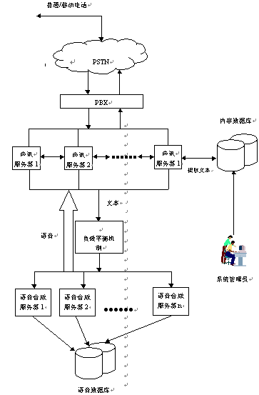 當用戶通過電話向聲訊服務器發(fā)出請求時,聲訊服務器會首先作出分析判斷,然后從內容數據庫中提取相應的文本信息,經過負載平衡機制發(fā)送給語音合成服務器。語音合成服務器在接收到文本后立刻開始合成,同時將合成好的語音發(fā)送回語音服務器,再由語音服務器回傳給用戶。其中內容數據庫中的信息可以由系統(tǒng)管理員定期進行維護管理。(系統(tǒng)連接結構見流程圖)