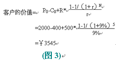 假設(shè)客戶與公司保持交易時(shí)間:N=5年;公司最初吸引每個(gè)客戶的成本(營(yíng)銷(xiāo)費(fèi)用): C0=¥400;客戶第一次購(gòu)買(mǎi)的產(chǎn)品價(jià)格:P0=¥2000;公司期望每年從每個(gè)客戶處增加的收入:R=¥500;利率(一般指貸款利率): r =9%;那么客戶的價(jià)值等于:客戶初次購(gòu)買(mǎi)產(chǎn)品和以后幾年每年消費(fèi)價(jià)值的折現(xiàn)之和,減營(yíng)銷(xiāo)成本,即: