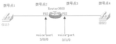 (1)在裝有兩個(gè)語音模塊的3600路由器上實(shí)現(xiàn)IP語音電話(如下圖所示)。