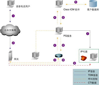 (1)一個客戶通過PSTN發(fā)出一個基于TDM平臺的呼叫。(2)企業(yè)聯(lián)絡(luò)中心的VoIP網(wǎng)關(guān)收到這一呼叫,并把它從TDM形式轉(zhuǎn)換為IP形式。(3)該VoIP網(wǎng)關(guān)發(fā)出一個路由申請,包括撥號號碼等給Cisco