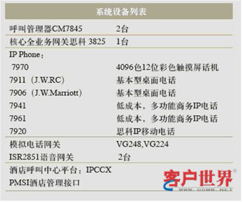 目前整個(gè)酒店IP電話系統(tǒng),采用兩個(gè)7845Call Manger,提供互相冗余備份。一套PMSI酒店管理接口,酒店呼叫中心平臺(tái):IPCCX,兩臺(tái)ISR2851語(yǔ)音網(wǎng)關(guān)。酒店還為每個(gè)客房提供一部7970彩屏IP終端,同時(shí)為了顧客的方便還在床頭還提供一部7906或者7911IP電話終端,足見酒店的體貼周到。酒店辦公管理和客服中心分別使用7941和7961,同時(shí)為了移動(dòng)方便,酒店還采用了Wi-Fi設(shè)計(jì),目前在酒店后臺(tái)管理采用了7920無(wú)線IP電話終端。