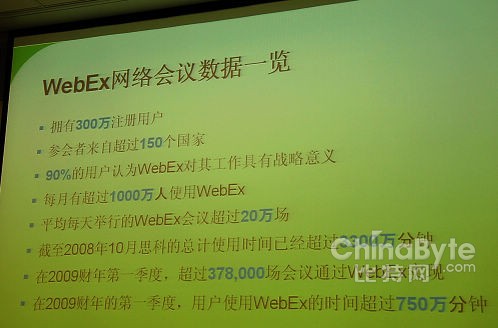 網(wǎng)絡(luò)會(huì)議在中國(guó)普及率還相對(duì)滯后,不同行業(yè)的跨度也不一樣,用WebEx做什么也有差異。制造業(yè)和高科技領(lǐng)域使用最廣,因?yàn)樗麄兿矚g學(xué)習(xí)使用高科技。目前正在向其他領(lǐng)域擴(kuò)展。比如目前阿里巴巴在用,也在慢慢擴(kuò)展到金融等行業(yè)。