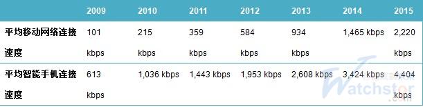 2009年到2010年一年間,平均移動網(wǎng)絡(luò)連接速度提升一倍,預期到2015年將會增加10倍。移動網(wǎng)絡(luò)連接速度是支持移動數(shù)據(jù)增長的主要因素。