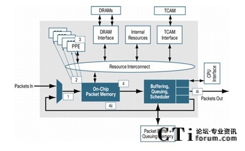 第一代QuantumFlow處理器(QFP)使用90nm工藝, QFP擁有40個(gè)定制QFP數(shù)據(jù)包處理引擎(PPE),每個(gè)PPE支持4個(gè)執(zhí)行線程。利用多達(dá)160個(gè)并行運(yùn)行的獨(dú)立處理器線程,平均每線程功耗僅0.51W, 遠(yuǎn)低于業(yè)界平均水平。同時(shí)QFP提供了一個(gè)高速的多核互聯(lián)總線,確保每個(gè)內(nèi)核都能及時(shí)快速的訪問到相關(guān)的資源,并且能夠避免在不夠先進(jìn)的硬件架構(gòu)中常見的CPU過度使用和超長(zhǎng)延遲問題,而傳統(tǒng)的網(wǎng)絡(luò)處理器架構(gòu)僅有少量的內(nèi)核,因此需要使用交換矩陣或總線將多塊網(wǎng)絡(luò)處理器互聯(lián)才能達(dá)到和QFP相同的處理速度,其功耗遠(yuǎn)高于QFP系統(tǒng),而多塊網(wǎng)絡(luò)處理器資源互相訪問將會(huì)帶來(lái)大量的數(shù)據(jù)包延遲。