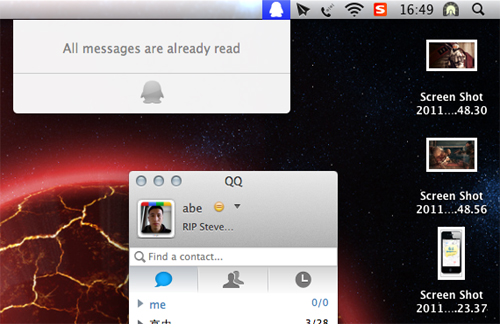 蘋果產(chǎn)品蘋果上的QQ客戶端QQ for Mac剛剛發(fā)布了最新版客戶端,主要增加了三個功能:語音聊天、通知欄消息提示、以及多文件傳輸。
