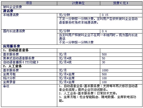 主叫通話費、被叫企業(yè)通話費和應用服務費按虛擬呼叫中心業(yè)務資費執(zhí)行。