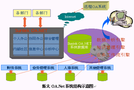 新太OA.NET系統(tǒng)采用B/S結(jié)構(gòu)設(shè)計,系統(tǒng)以提供大量快速靈活的自定義功能以及許多核心平臺產(chǎn)品,如協(xié)同工作平臺、通訊平臺、知識管理平臺、信息服務(wù)平臺等,能夠幫助用戶快速實施信息化建設(shè),OA.NET系統(tǒng)的最大特色是實現(xiàn)"零代碼"維護功能,系統(tǒng)安裝后,無需編寫任何代碼就可生成各種辦公業(yè)務(wù)應(yīng)用,用戶只需幾個小時的培訓(xùn)就可以使用OA.Net提供的工具進(jìn)行復(fù)雜辦公流程的設(shè)計,并且可以不需要經(jīng)過任何編碼的改動,就能輕松適應(yīng)流程變化的新情況。另外,OA.NET強調(diào)對企業(yè)內(nèi)部知識的有效管理和有效利用,能夠沉積企業(yè)日常的零散信息,并通過有序歸類的方式使之成為對企業(yè)有用的知識。OA.Net還提供了功能強大的個性化配置功能,每個員工都可以定制自己的界面風(fēng)格和功能模塊,并且可以自己建立個人的應(yīng)用環(huán)境,滿足個人的喜好。OA.Net包含了新太自主開發(fā)的業(yè)務(wù)工作流處理引擎,能夠在不用編寫代碼的情況集成其他業(yè)務(wù)系統(tǒng),實現(xiàn)了業(yè)務(wù)系統(tǒng)中的數(shù)據(jù)和辦公流程的完美結(jié)合,使得辦公應(yīng)用系統(tǒng)真正成為企業(yè)內(nèi)部的廣義化辦公門戶。