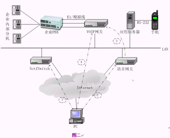 用戶使用系統(tǒng)時,需要先下載終端并安裝到PC上,然后在終端上撥企業(yè)內(nèi)部的分機(jī)號碼就可以了。對于一般的企業(yè),VoIP語音網(wǎng)關(guān)可以配置幾條模擬線到一個E1的規(guī)模,SoftSwitch、語音網(wǎng)關(guān)、應(yīng)用服務(wù)器可以安裝在一臺PC或PC服務(wù)器上,或者與企業(yè)的其它服務(wù)器(如代理服務(wù)器)合用,另外需要一到兩個公網(wǎng)IP地址資源。系統(tǒng)的硬件和網(wǎng)絡(luò)成本非常低,整個系統(tǒng)如果按一個E1(30路)容量計算,配置VoIP網(wǎng)關(guān)和一臺PC服務(wù)器,硬件價格不超過3萬元,如果VoIP網(wǎng)關(guān)支持隧道模式傳送信令和語音,則語音網(wǎng)關(guān)也可以省去。