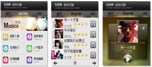 6)彩鈴定制業(yè)務(wù)。傳統(tǒng)彩鈴定制業(yè)務(wù)基于純語(yǔ)音IVR的環(huán)境下使用起來(lái)非常繁瑣,進(jìn)行彩鈴檢索比較麻煩,選擇的準(zhǔn)確度也很低。手機(jī)客戶端軟件的應(yīng)用,提供了可視化的交互方式,讓業(yè)務(wù)使用起來(lái)直觀便捷很多。用戶通過(guò)聲動(dòng)魅力完成彩鈴信息的瀏覽、試聽、定制過(guò)程,用戶可以邊瀏歌曲的同時(shí)邊聽到語(yǔ)音對(duì)歌曲的介紹,并可試用該歌曲。下圖即為彩鈴定制業(yè)務(wù)操作界面: