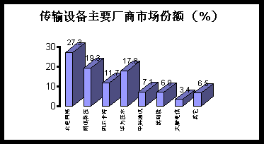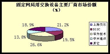 (2)市場特點:市場份額進一步向業(yè)內(nèi)領先者集中,華為技術、上海貝爾、BISC 依然保持該領域三甲地位,市場份額占市場總量的67.3%。上述三家廠商各自的市場份額分別占到市場總量的26.6%、21.2%、19.5%。 此外,以中興通訊 、華為技術為代表的非外資設備廠商積極開拓國外市場以實現(xiàn)其國際化發(fā)展戰(zhàn)略。 中心城市市場趨于飽和,市場競爭焦點向本地網(wǎng)機型拆換和中小城市以下市場轉移。激烈的價格競爭導致該市場平均利潤微薄。