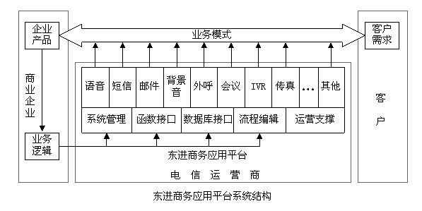 從應(yīng)用角度看,東進(jìn)商務(wù)應(yīng)用平臺將業(yè)務(wù)分為3個部分--企業(yè)端的業(yè)務(wù)邏輯、電信運(yùn)營商端的業(yè)務(wù)實(shí)現(xiàn)和客戶端業(yè)務(wù)響應(yīng)。企業(yè)根據(jù)其產(chǎn)品特點(diǎn),制定相應(yīng)的業(yè)務(wù)邏輯,去控制電信運(yùn)營商的商務(wù)應(yīng)用平臺,平臺在業(yè)務(wù)邏輯的控制下,去響應(yīng)客戶端的業(yè)務(wù)需求,由此組成一個智能化的業(yè)務(wù)模式。