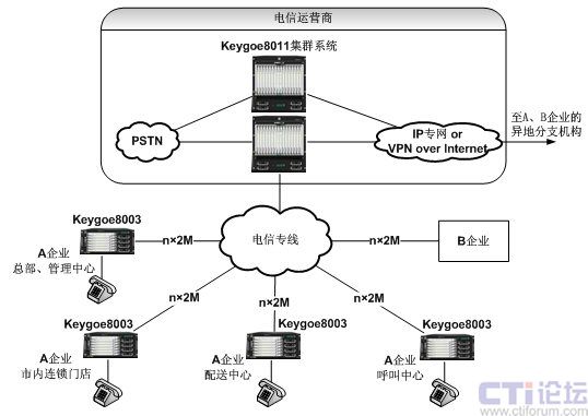 電信運營商在核心機(jī)房部署由東進(jìn)Keygoe系列多媒體交換機(jī)組成的高性能集群交換機(jī)系統(tǒng),各個企業(yè)以及各企業(yè)的市內(nèi)分支機(jī)構(gòu)(如管理中心、連鎖門店、配送中心、呼叫中心等)分別配置東進(jìn)Keygoe系列多媒體交換機(jī),并通過電信運營企業(yè)的2M專線(E1中繼)方式上聯(lián)到電信運營商核心機(jī)房的交換機(jī)集群系統(tǒng),組成一個以集群交換機(jī)系統(tǒng)為核心的星形網(wǎng)絡(luò)(如上圖所示)。所有的市話呼入和呼出都通過核心節(jié)點和電信運營商的中繼通道,為連鎖型商業(yè)企業(yè)提供內(nèi)部話音通訊的統(tǒng)一編號、統(tǒng)一撥號、統(tǒng)一維護(hù)和管理,企業(yè)對外公布統(tǒng)一和便于記憶的號碼,實現(xiàn)企業(yè)管理、營銷和客戶服務(wù)的統(tǒng)一化和規(guī)范化。核心機(jī)房的高性能集群交換機(jī)系統(tǒng)充分考慮冗余備份,如模塊和整機(jī)設(shè)備的雙冗余,從而提高整個通信平臺的高可用性和高可靠性。各個分支的多媒體交換機(jī)具備本地的獨立工作能力,即使在中繼線路出現(xiàn)故障的情況下,也能正常的工作。同時,Keygoe系列多媒體交換機(jī)集成了7號信令、會議、傳真、語音等豐富的多媒體處理資源,可以為用戶開發(fā)靈活多樣的智能業(yè)務(wù)和增值業(yè)務(wù),豐富了系統(tǒng)的應(yīng)用。