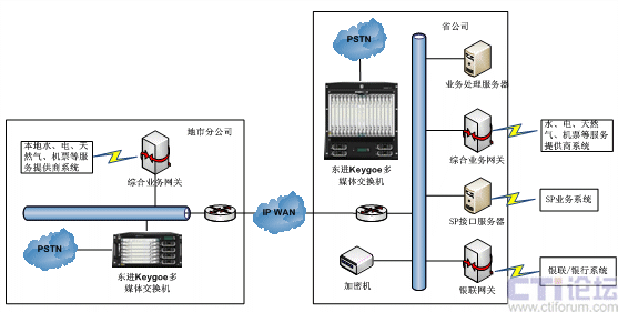 東進(jìn)固網(wǎng)支付平臺通過IP專網(wǎng)將省公司和各地市公司的系統(tǒng)連接起來,采取二級地市分公司數(shù)據(jù)接入、運(yùn)營商總部集中處理的拓?fù)浼軜?gòu),實(shí)現(xiàn)業(yè)務(wù)的全省統(tǒng)一運(yùn)營。各地市公司分別建設(shè)一套接入平臺,業(yè)務(wù)處理服務(wù)器統(tǒng)一建設(shè)在運(yùn)營商總部。各地市的水、電、煤氣、電信、彩票等外部系統(tǒng)通過在本地建設(shè)的綜合業(yè)務(wù)網(wǎng)關(guān)與業(yè)務(wù)系統(tǒng)對接,支付業(yè)務(wù)統(tǒng)一通過運(yùn)營商總部所在地銀聯(lián)轉(zhuǎn)到各地銀聯(lián)進(jìn)行。