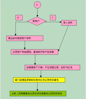 可以根據(jù)訂單上的不同顏色來判斷流程走到的階段。流程開始時(shí)候,訂單的列表中會產(chǎn)生一條紅色記錄,部門經(jīng)理登錄審核后使該紅色記錄變成黃色,倉庫人員根據(jù)黃色記錄發(fā)貨后使黃色記錄變成綠色。