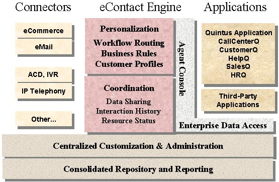 在CRM的實施中,有很多決定實施成敗的關(guān)鍵因素,其中之一就是CRM解決方案。目前,市場上的CRM產(chǎn)品林林總總,如國外的Siebel、SAP、Oracle、Clarify、Vantive,國內(nèi)創(chuàng)智的PowerCRM、用友的NC/CRM、聯(lián)成互動的MyCRM、中圣的SellWell、TurboCRM等,各有自身的特色和優(yōu)勢。本文將從CRM理念的角度介紹另一款CRM解決方案——Quintus eContact Suit(簡稱QeS)解決方案,以供用戶甄選。