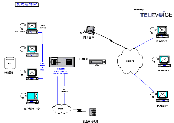 ACC2000通過H.323協(xié)議連接Internet,遠(yuǎn)程人員在任何位置(使用配備聲卡和耳麥的PC)只要登錄Internet即可實(shí)現(xiàn)遠(yuǎn)程座席功能.