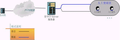 上圖是客服中心較常見的結(jié)構(gòu)圖,相當(dāng)于將初級(jí)客服的CT-Server服務(wù)器一分為三。原來的語音板卡由現(xiàn)在真正的PBX替代,青牛USE和青牛ATS則是從CT-Server軟件包中獨(dú)立出來,強(qiáng)化各自的核心功能,運(yùn)行在兩臺(tái)單獨(dú)的服務(wù)器上(IVR服務(wù)器還是需要語音板卡來處理話路,但語音板卡已經(jīng)不負(fù)責(zé)PBX的交換功能了)。這種類型的客服中心可以給客戶更大規(guī)模的、更穩(wěn)定的服務(wù),并且撥入電話的客戶感覺不到系統(tǒng)的變化。