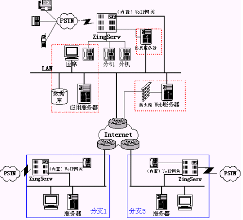 目前清華誠(chéng)志數(shù)碼公司分支機(jī)構(gòu)有5個(gè),可以通過(guò)ZingServ交換機(jī)的內(nèi)置VoIP功能在5個(gè)分支機(jī)構(gòu)實(shí)現(xiàn)組網(wǎng),從而大大節(jié)省長(zhǎng)話(huà)費(fèi)用,并實(shí)現(xiàn)內(nèi)部分機(jī)號(hào)統(tǒng)一編碼: