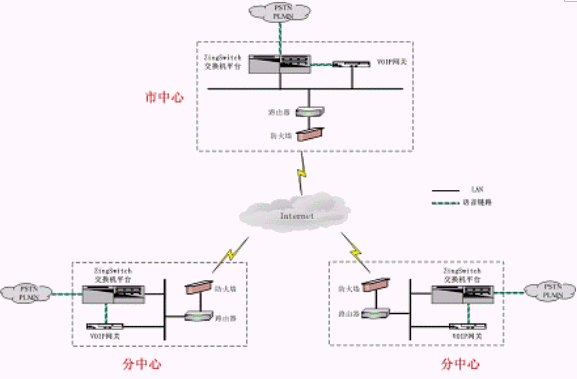 系統(tǒng)在市中心點(diǎn)和分布的遠(yuǎn)程座席所在縣市區(qū)分別部署相應(yīng)的VoIP網(wǎng)關(guān),市中心和各個(gè)縣市區(qū)都通過(guò)互聯(lián)網(wǎng)進(jìn)行連接和語(yǔ)音傳輸,客戶與遠(yuǎn)程座席之間的交流與普通的集中座席員之間毫無(wú)區(qū)別,遠(yuǎn)程座席只相當(dāng)于ZingSwitch交換機(jī)的一個(gè)遠(yuǎn)程分機(jī)。
