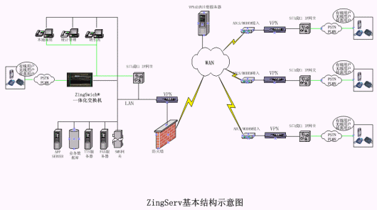 硬件:坐席集中的中心點都有ZingSwitch®交換機,S口網(wǎng)關(guān)和CO8卡或E1接口網(wǎng)關(guān)和E1卡。VPN動態(tài)注冊服務(wù)器和VPN設(shè)備,或GK服務(wù)器。