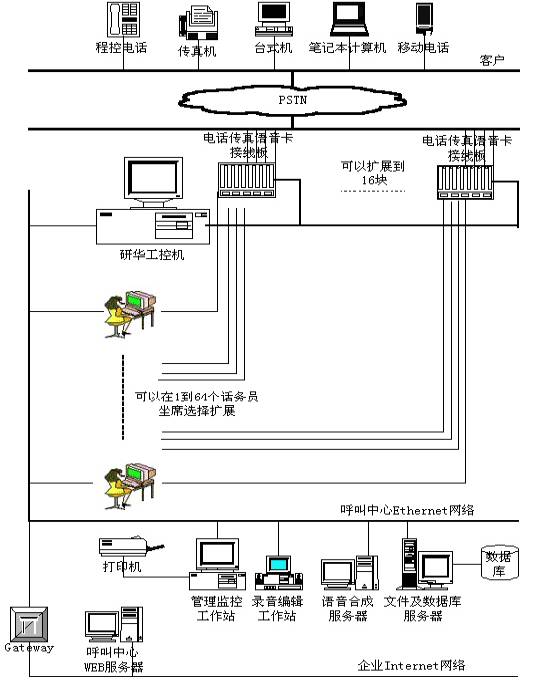 硬件主要由電話接口工控機(jī)(內(nèi)部的安裝電話語(yǔ)音卡)、主服務(wù)器、管理計(jì)算機(jī)、人工坐席計(jì)算機(jī)、電話機(jī)(包括頭戴耳麥)、計(jì)算機(jī)網(wǎng)絡(luò)連接設(shè)備和電話線路連接設(shè)備組成。