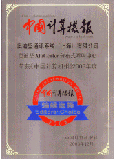 奧迪堅(jiān)基于IP分布式呼叫中心平臺榮獲中國計(jì)算機(jī)報2003年度編輯推薦獎!吨袊(jì)算機(jī)報》(CIW-China