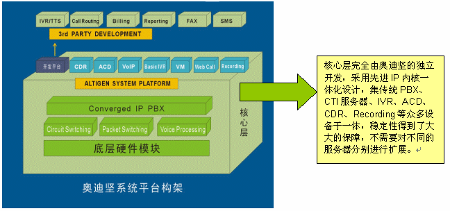 值得一提的是,在穩(wěn)定性上,奧迪堅IP一體化呼叫中心平臺系統(tǒng)構架,從產品設計之初就突破了以住基于交換機或板卡的傳統(tǒng)模式,在一臺通訊服務器上高度融合了呼叫中心的所有常用功能,有效避免了復雜的網絡連接和眾多的各類交換機和外掛設備,各個設備相對獨立兼容性差所給呼叫中心系統(tǒng)所帶的穩(wěn)定性欠佳的隱患。除此之外,奧迪堅呼叫中心系統(tǒng)底層硬件模塊是在美國設計生產的,通過北美和中國的嚴格的電信入網測試;相對于硬件,平臺軟件也都是由奧迪堅自主開發(fā)設計的,針對不同的硬件采用不同的驅動模塊,軟硬一體在交換層又使用統(tǒng)一的邏輯接口,結構清晰,層次合理,不僅保障了穩(wěn)定而且便于擴展(如下圖所示),整個系統(tǒng)作為一個整體統(tǒng)一擴展,不需要對不同的服務器分別進行擴展,有效避免了傳統(tǒng)呼叫中心構建方式在擴展方面存在的復雜性問題以及高額的擴展費用。