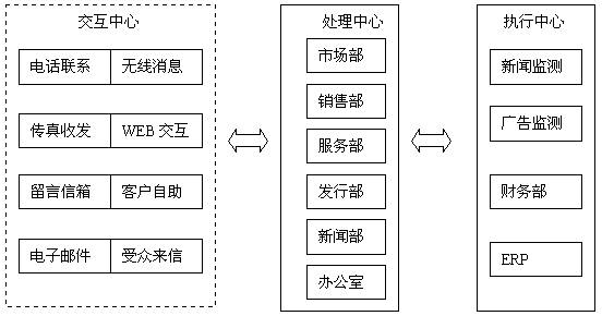 協(xié)同CRM結(jié)合呼叫中心與客戶廣泛交互,對信息進(jìn)行全面綜合處理。系統(tǒng)可以分為交互中心、處理中心、執(zhí)行中心三部分。