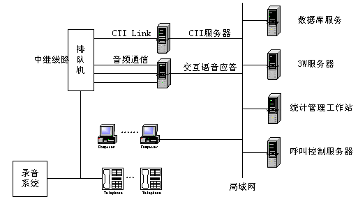 ACD方式即前置交換機+語音服務(wù)器,即在專用交換機+ACD(自動話務(wù)分配)的基礎(chǔ)上擴展功能,用CTI技術(shù)實現(xiàn)通信和計算機的功能結(jié)合,并配以必要的語音和數(shù)據(jù)庫系統(tǒng)。