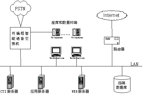 新一代呼叫中心主要由可編程智能語音交換機、業(yè)務(wù)代表座席、CTI服務(wù)器、