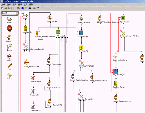 GVP提供了界面友好的功能強(qiáng)大的語音應(yīng)用開發(fā)工具-Genesys Studio,其中預(yù)定了豐富的控件,用來實現(xiàn)菜單語音播報、DTMF收集以及對數(shù)據(jù)庫查詢等諸多功能。通過拖放的方式就可以快速的隨心所欲地設(shè)計出你所需要的語音邏輯應(yīng)用流程,最終編譯產(chǎn)生用于發(fā)布的ASP或者JSP頁面。應(yīng)用之間可以彼此調(diào)用,提高了語音應(yīng)用的靈活性和可重用性。Genesys Studio還提供了靈活實用的調(diào)試工具,可以隨意設(shè)置斷點實時跟蹤流程的執(zhí)行情況,極大的方便了語音應(yīng)用流程的調(diào)試。