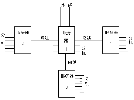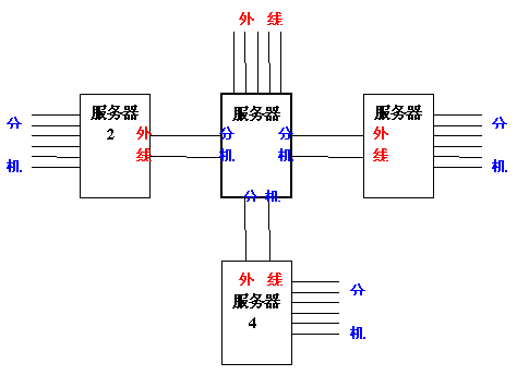 系統(tǒng)中服務(wù)器1/2/3/4之間互相通訊依靠電話線。服務(wù)器1的分機端口與服務(wù)器2/3/4的外線端口相連。所有的外線裝配在主服務(wù)器1上。