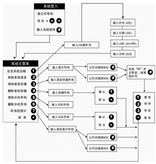 客戶可按照需要修改系統(tǒng)的自動總機設(shè)置,錄制自己的公司總機問候語和進行其他相應(yīng)設(shè)置。