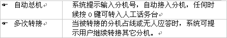 若您要的分機(jī)正在忙或分機(jī)主人不在電話機(jī)旁,可直接轉(zhuǎn)到留言信箱,止項功能要求在交換機(jī)數(shù)據(jù)庫中設(shè)置分機(jī)遇忙/無應(yīng)答轉(zhuǎn)移到留言信箱。