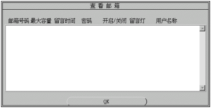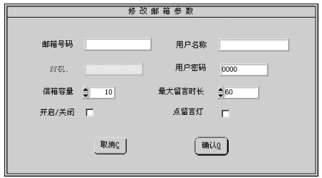 1). 您可修改的參數(shù)有:用戶名稱、用戶密碼、信箱容量、最大留時長、開啟/關(guān)閉、點留言燈。有關(guān)參數(shù)的細(xì)節(jié)將在增加信箱一節(jié)中介紹。