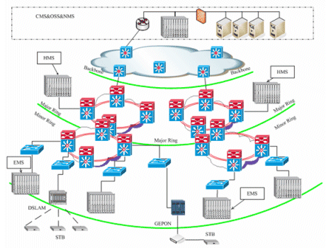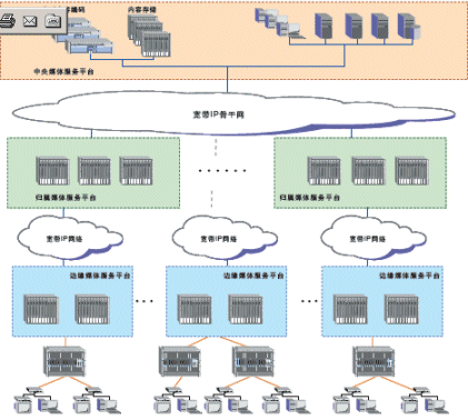 奔流(RollingStream)系統(tǒng)可以支持百萬級別的用戶規(guī)模,支持3級和多級部署架構。包括中心節(jié)點(CMS)、區(qū)域匯聚節(jié)點(HMS)以及邊緣服務節(jié)點(EMS)。奔流(RollingStream)系統(tǒng)對于寬帶IP網絡的容忍度是很高的,可以支持各種網絡承載形式,也可支持各種接入方式。如LAN接入、DSLAM接入、GEPON接入。對于IPTV系統(tǒng),可建設專網,CMS和HMS、EMS直接相連,也可以旁掛在城域網上。另外,無論PPPoE還是DHCP上網方式都可以支持。