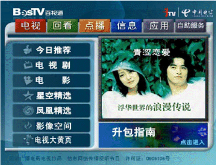 - 支持高品質視頻類、信息類、通信類服務,多款機頂盒提供包括直播電視、VOD、時移電視,TVOD,信息類,遠程教育,卡拉Ok,游戲,即時通訊等所有triple