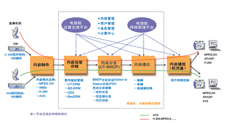 奔流(RollingStream)系統(tǒng)為IPTV業(yè)務提供了端到端的業(yè)務解決方案,先進的系統(tǒng)架構對Codec完全透明,可透明支持AVS,如下圖。奔流(RollingStream)系統(tǒng)包括內容制作、內容存儲/加密、內容分發(fā)、內容播放、終端顯示的各個方面,都可提供基于電信級的解決方案。