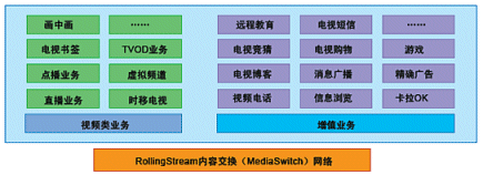 奔流(RollingStream)系統(tǒng)不僅僅支持以LiveTV、Timeshift-TV、VOD、TVOD等為基礎的各項功能,而且具有良好的功能上的可擴展性,在此平臺上可以支持眾多豐富多彩的增值互動業(yè)務;诒剂(RollingStream)具有無限的業(yè)務增長空間,如下圖所示意: