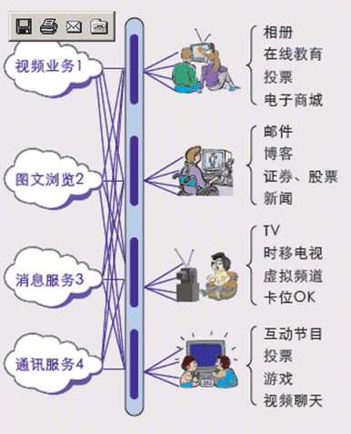 - 豐富多彩的互動增值業(yè)務: 可視電話、電視短信、電視競猜、電視投票、游戲、信息瀏覽等