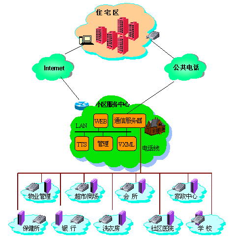 以國際標(biāo)準(zhǔn)的VXMLl技術(shù)為主導(dǎo)的小區(qū)服務(wù)中心系統(tǒng)可以與互聯(lián)網(wǎng)輕易地連通,從而為小區(qū)的服務(wù)網(wǎng)點(diǎn)走出小區(qū)的地域限制做好技術(shù)上的儲(chǔ)備。vxml的易開發(fā)和易擴(kuò)展性,使得遠(yuǎn)程服務(wù)的增加,幾乎不需要任何成本的追加,任何第三方服務(wù)提供者具備vxml業(yè)務(wù),都可以直接掛到服務(wù)中心上來。