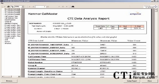 如果響應(yīng)時間超過設(shè)定的預(yù)置值(閥值),或者發(fā)現(xiàn)任何其它問題時,Hammer可以把這個錯誤和它的位置記錄在數(shù)據(jù)庫中,然后實(shí)時顯示測試結(jié)果。Hammer可以模擬呼叫流程中的任何一個方面,包括DTMF按鍵音可變信息的記錄或者是為測試支持語音識別系統(tǒng)而播放大量的語音文件。Hammer專利的語音提示識別能力更可以自動檢驗(yàn)在IVR和ACD/PBX系統(tǒng)中是否正確播放語音提示。