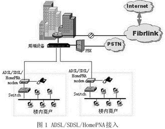 中電飛華在光纖(或其他專線)接入的基礎(chǔ)上提供樓宇、小區(qū)的整體接入解決方案,即在光纖接入到樓宇和小區(qū)之后,通過各種接入手段將樓內(nèi)商業(yè)用戶、小區(qū)個(gè)人用戶等接入Internet。根據(jù)樓內(nèi)/間布線情況采用不同的接入方法,包括ADSL、SDSL、HomePNA接入以及以太網(wǎng)接入等。