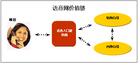 許多語(yǔ)音入口提供商向個(gè)人和公司提供語(yǔ)音網(wǎng)上的服務(wù),而內(nèi)容和結(jié)構(gòu)公司則向這些入口提供商提供技術(shù)支持、產(chǎn)品和主機(jī)服務(wù)。