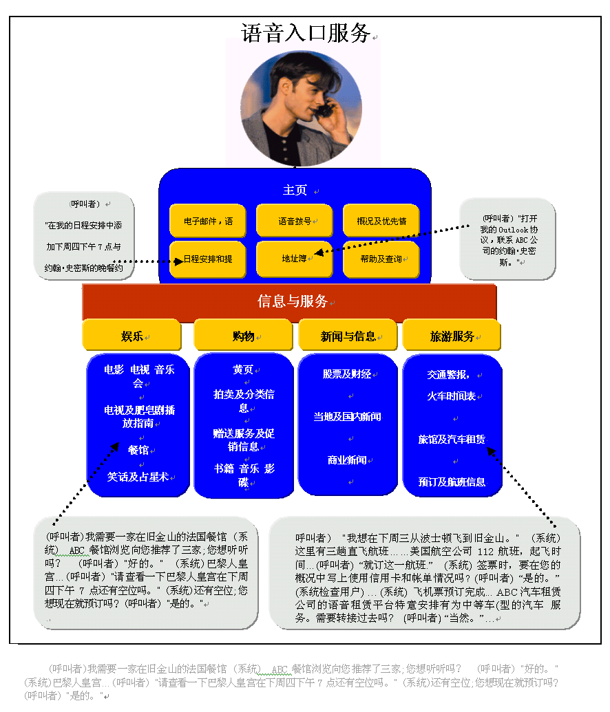 語(yǔ)音網(wǎng)最吸引人之處就在于它可以在一次通話中,同時(shí)處理多個(gè)任務(wù)。下圖表明一名商務(wù)人員是如何安排好與一個(gè)未來(lái)的商務(wù)旅行有關(guān)的一系列任務(wù)的。他獲取了對(duì)自己有用的信息,順利達(dá)成了一項(xiàng)語(yǔ)音商務(wù)交易,接收個(gè)人信息和辦公室的幫助,并撥打電話所有這些都是在一個(gè)同步過(guò)程中完成的。