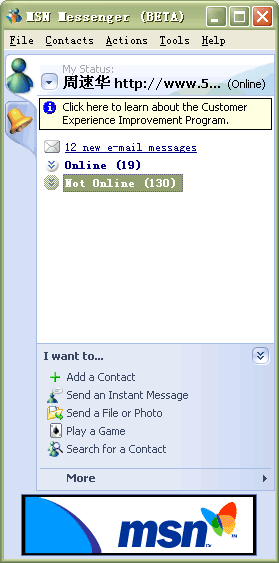 5月26日,微軟最新即時通訊軟件MSN Messenger的最新版本MSN Messenger Beta 6.0.0250被提前遭遇外泄,使得大家提前領(lǐng)略到了微軟最新的即時通訊軟件風(fēng)采。這也是微軟.net計劃中的一個重要組成部分,也讓我們看到了一些微軟“格林威治(Greenwich)”的影子!案窳滞(Greenwich)”――是微軟基于.net戰(zhàn)略的能夠?qū)崟r進(jìn)行通信等的服務(wù)器軟件的開發(fā)代號。由于未對外正式發(fā)布,此次公開的是MSN