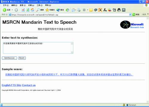 通過“木蘭”在線演示系統(tǒng):“http://research.microsoft.com/speech/tts”(中文)與“http://research.microsoft.com/speech/engtts”(英文),人們可以親身體驗MSRA的研究成果。