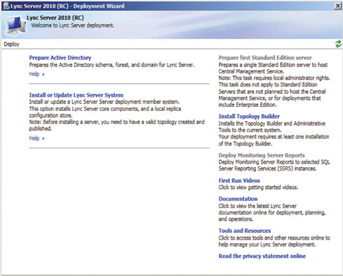 準備好基礎(chǔ)結(jié)構(gòu)并發(fā)布拓撲后,即可開始安裝前端服務(wù)器和服務(wù)器角色,以啟用 A/V 會議、企業(yè)語音、監(jiān)控、存檔及其他功能。準備每臺服務(wù)器從運行部署向?qū)В▍⒁妶D 3)開始,但每個服務(wù)器角色都有自己的安裝和配置要求。您可以在 TechNet 庫的“部署 Lync Server 2010 Standard Edition”部分查找更多詳細信息。